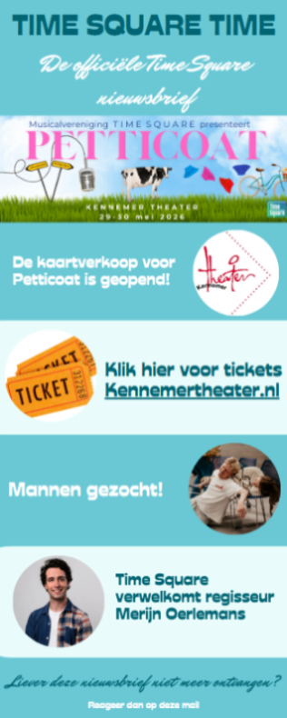 Time Square is gestart met de repetities voor de musical Petticoat. Ben je geïnteresseerd? Mail even met onze secretaris: secretaris.timesquare@gmail.com.